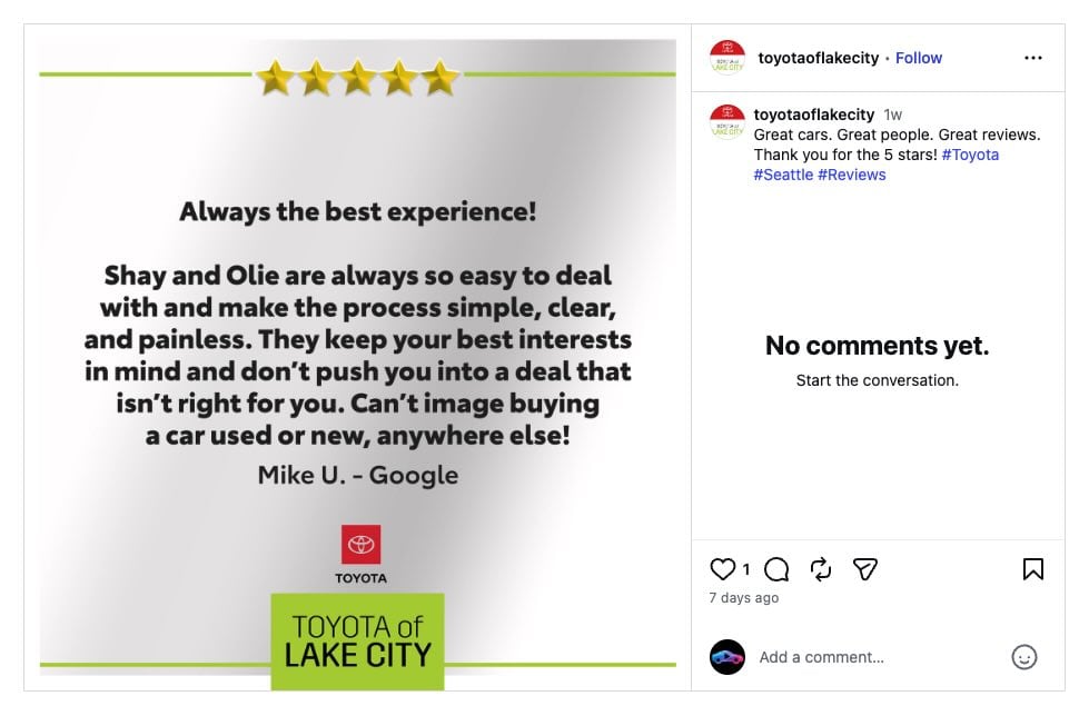 This isn’t about becoming an influencer (remember, we’re trying to sell cars, after all). It’s about being recognizable in your local market.